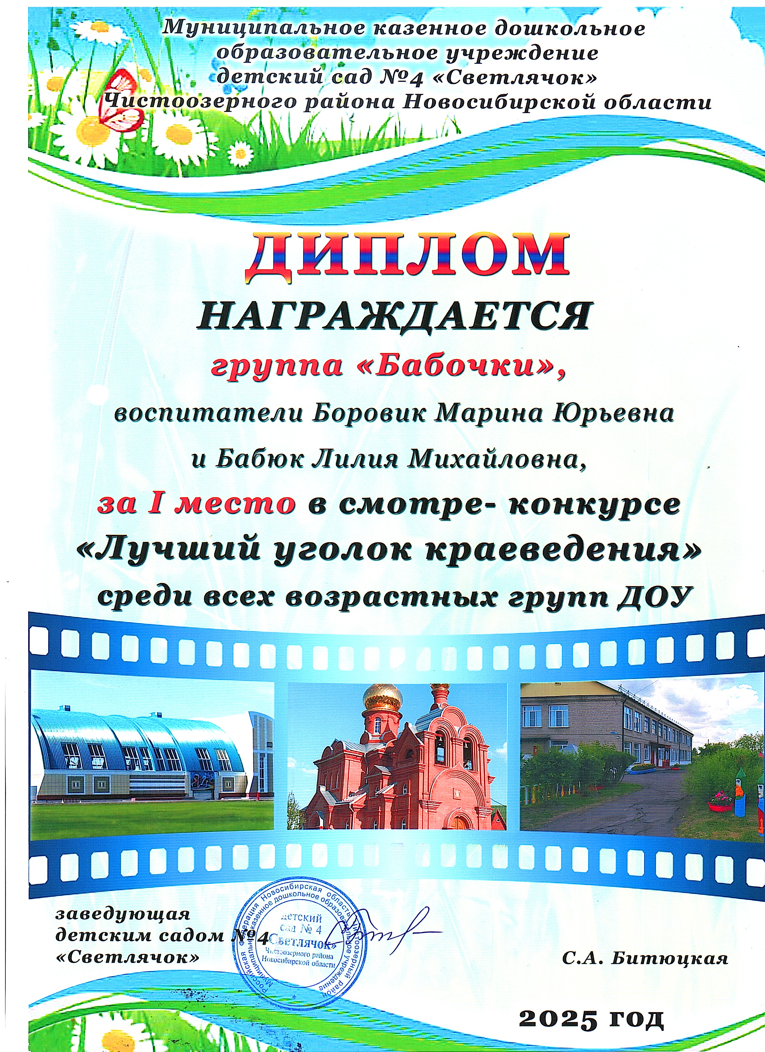 Диплом за 1 место в смотре-конкурсе "Лучший краеведческий уголок"